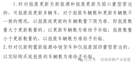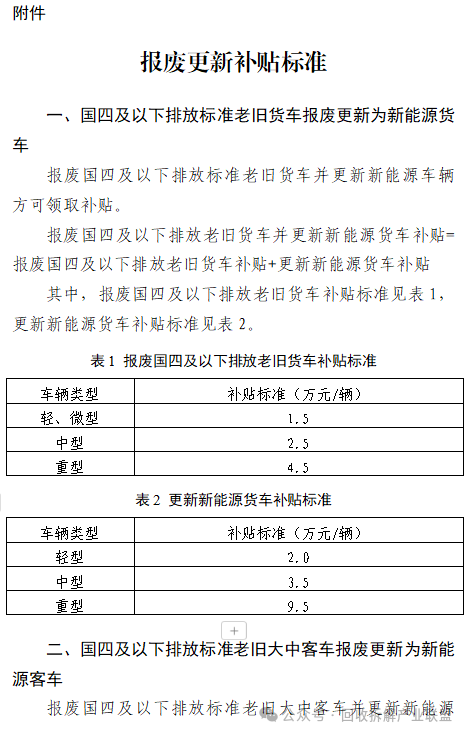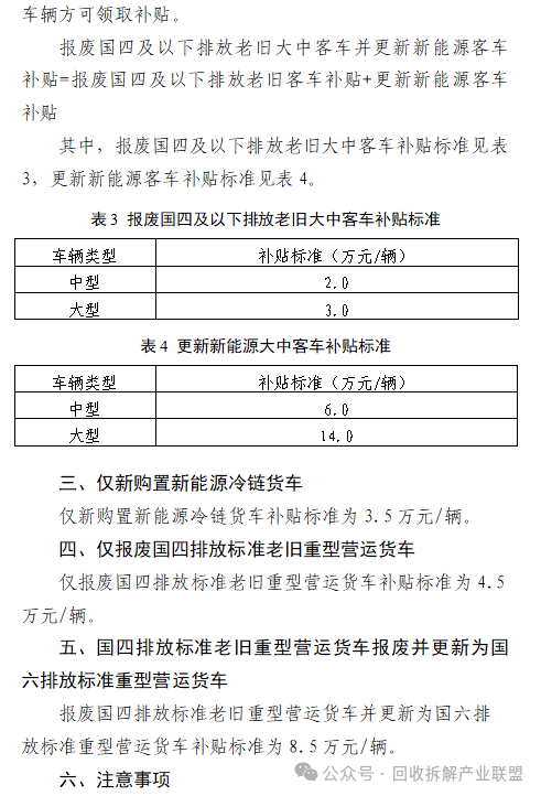 本实施细则对国四及以下排放标准老旧货车和大中型客车报废并更新为新能源车辆(以下简称“报废更新为新能源”)的车主,仅新购置新能源冷链货车、仅报废国四排放标准老旧重型营运货车(以下简称“仅报废国四重型营运”)、国四排放标准老旧重型营运货车报废并更新为国六排放标准重型营运货车(以下简称“报废更新为国六重型营运”)的业户给予补贴。